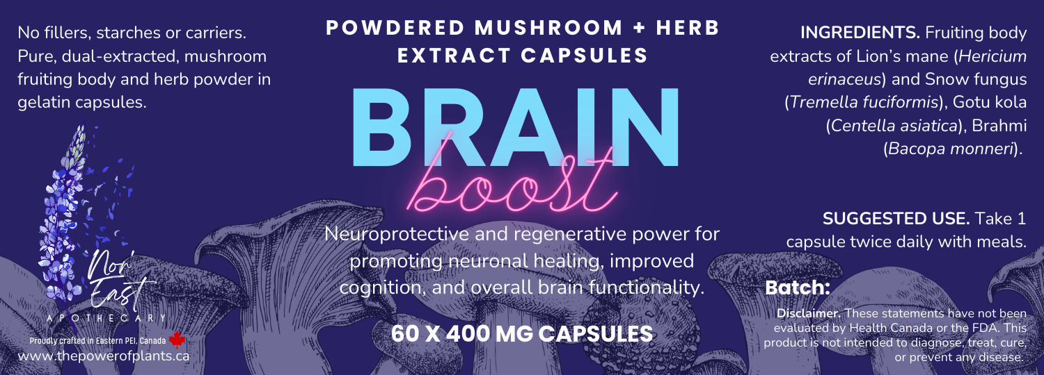 Our Brain Boost formula combines concentrated extracts of Lion's Mane and Snow Fungus mushrooms together with powdered Brahmi, Gotu Kola, and Rosemary. This synergistic combination promotes increased blood circulation and reduces inflammation in the brain. Lion's Mane and Snow Fungus are renowned for their neuroprotective and cognition-boosting properties, with Lion's Mane specifically noted for stimulating neuronal growth and potentially reversing neurodegeneration.
